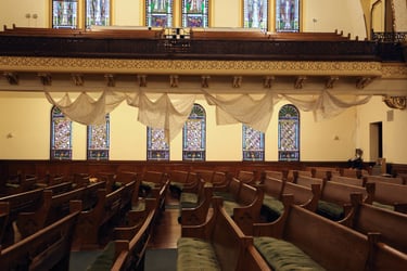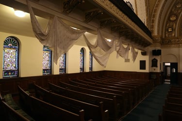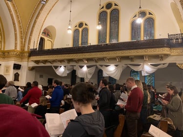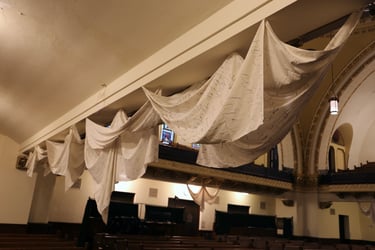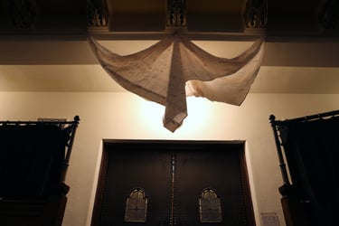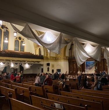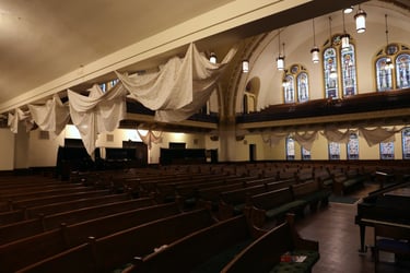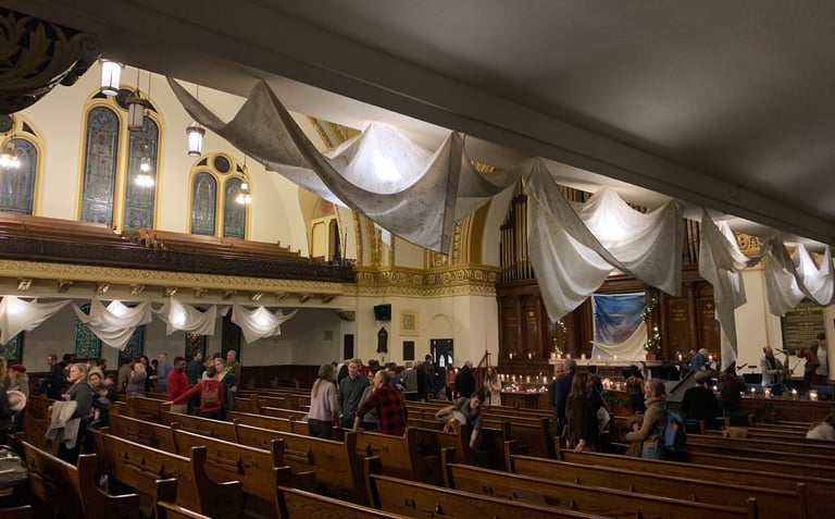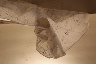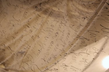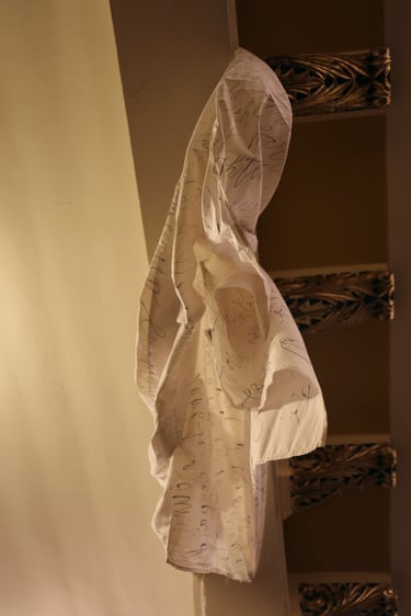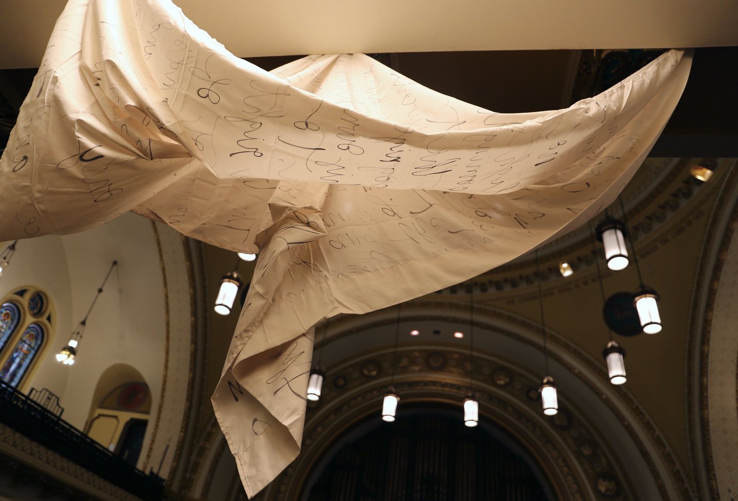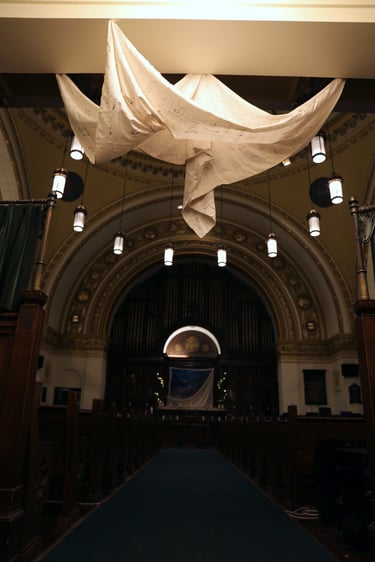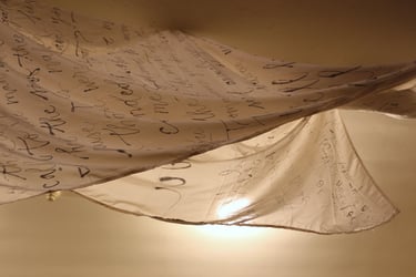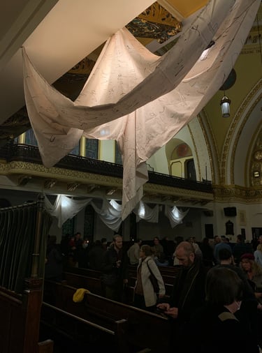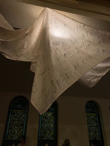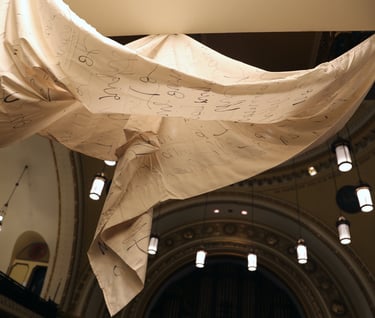 Coming is an Advent-themed textile installation work that features nine hanging cloths. Advent is a season of intentioned waiting, anticipation, and celebration observed by most Christian denominations between the end of November and December. Each of the nine cloths is covered in handwritten text that corresponds with nine biblical scriptures that predicate the coming of Jesus Christ of Nazareth, the central figure of Christian faith. The words on the cloth are tangible, paralleling the celebration of the divine scriptures' incarnation in Christ’s first coming. The cloth is also hung in a way that could be interpreted as ascending or descending, just as the holy Word has been given from heaven and yet is lifted up again through contemplation and veneration. The unveiling of this installation took place during a Lessons & Carols service in the historical church building at Sansom & 17th Street in Center City, Philadelphia, USA. During the service the cloths engage in a sort of performance where Towsley illuminates a single cloth as its' inscribed scripture is read aloud by a liturgist. The congregants of Resurrection Philadelphia participate in the traditional liturgy of this service (songs, lessons and scriptures may be explored in the bulletin below) while the installation itself conceptually enriches the worship of those who attend the service.