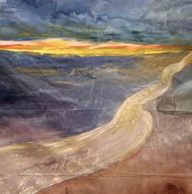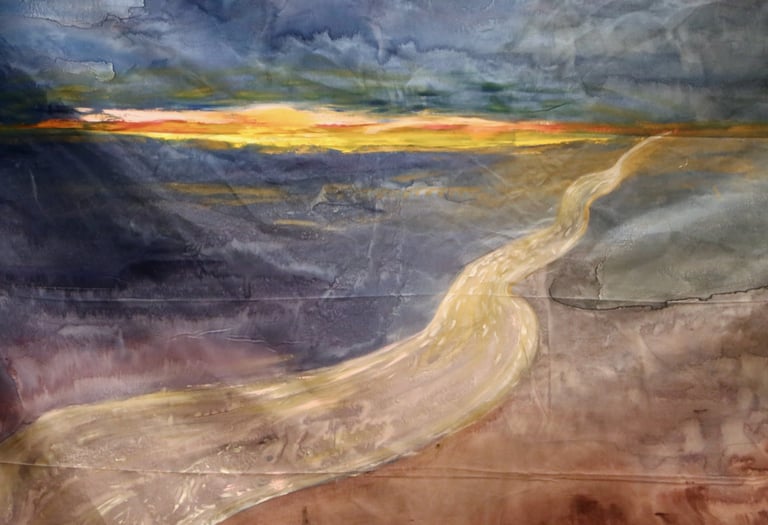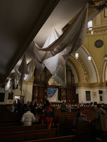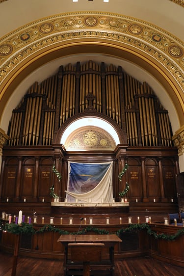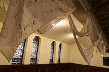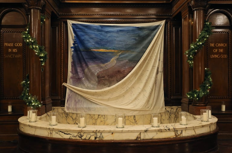 A tenth cloth hung at the front of the sanctuary above the baptistery features a painting of an abstracted landscape inspired by Malcolm Guite's poem, ‘O Oriens.' The words of this poem are written on the eleventh cloth draped in front of the painting: