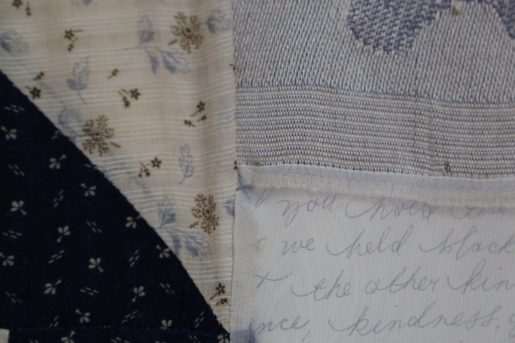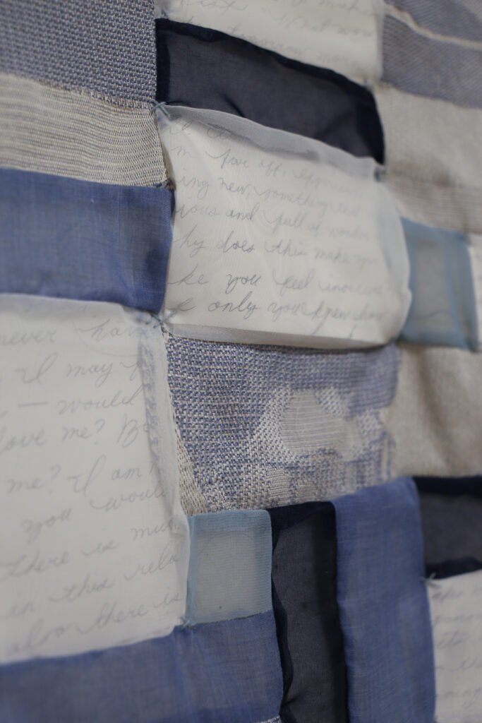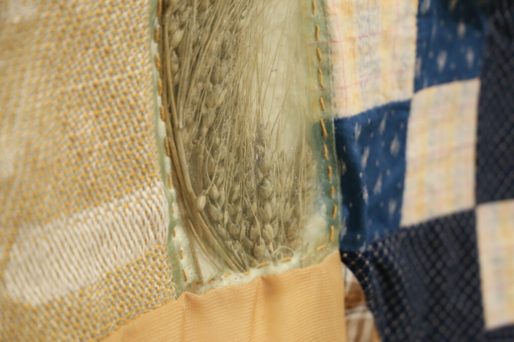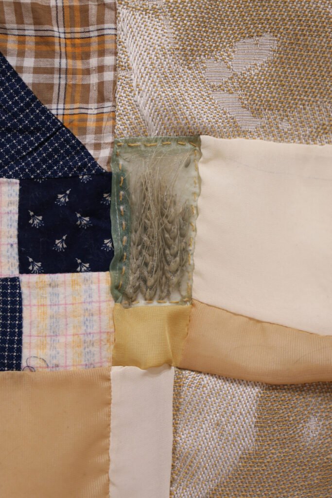 weaving fragments, 9 of Great-grandma Bertha’s quilt squares, various colors of chiffon & organza, wheat from Kansas family farm, handwritten poems and notes, cotton batting, satin backing and binding