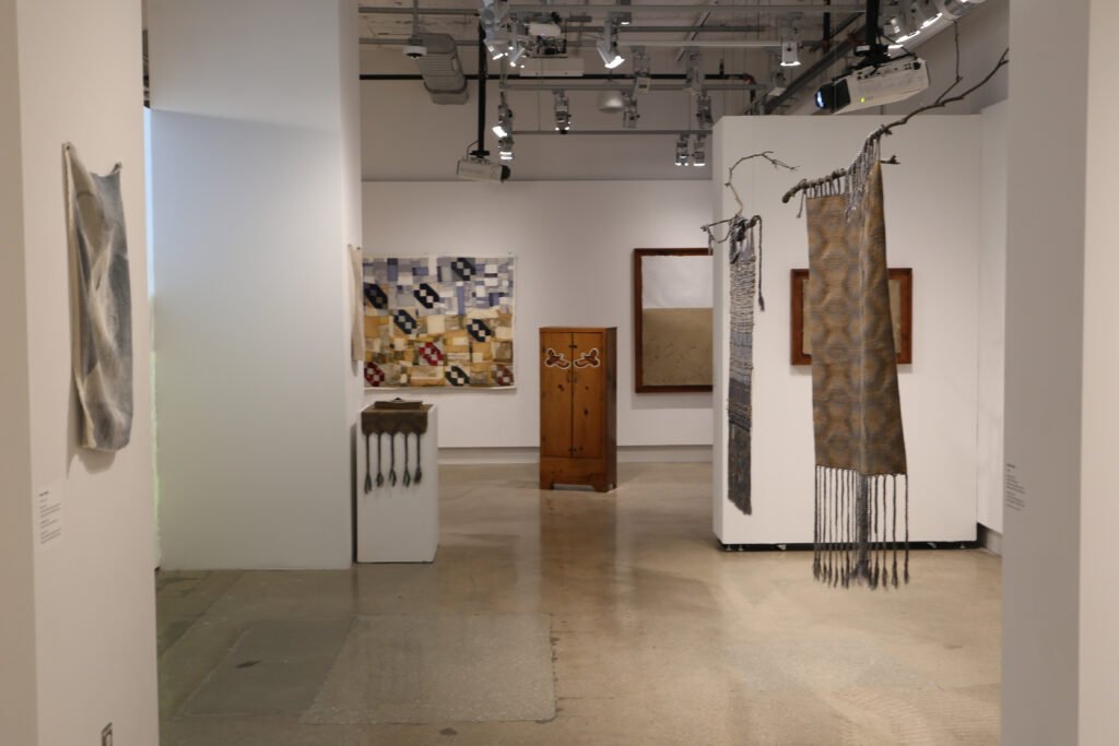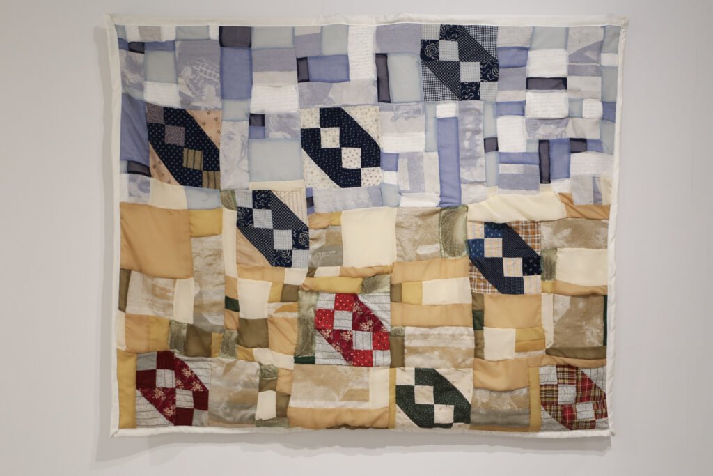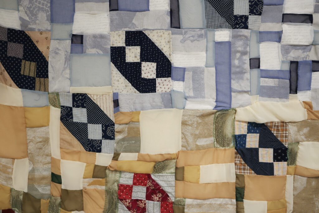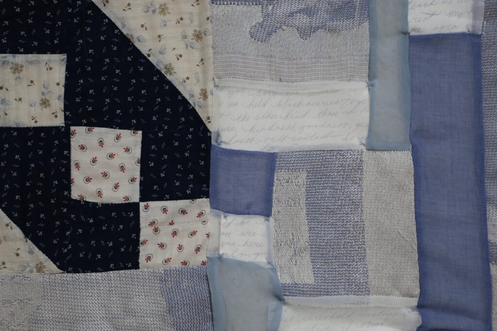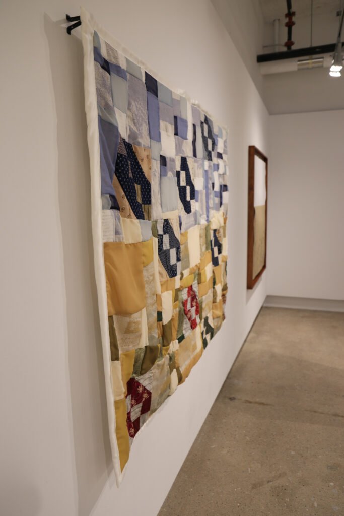 weaving fragments, 9 of Great-grandma Bertha’s quilt squares, various colors of chiffon & organza, wheat from Kansas family farm, handwritten poems and notes, cotton batting, satin backing and binding