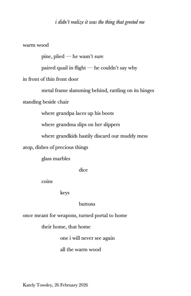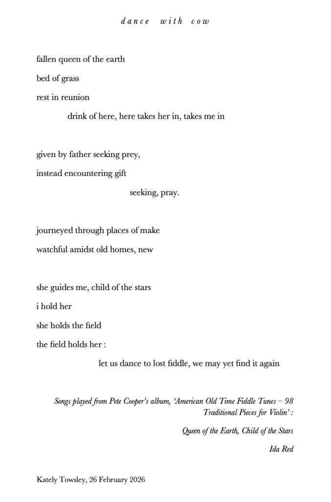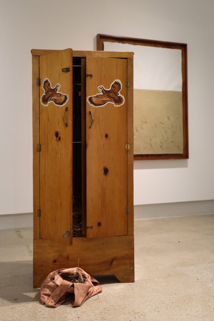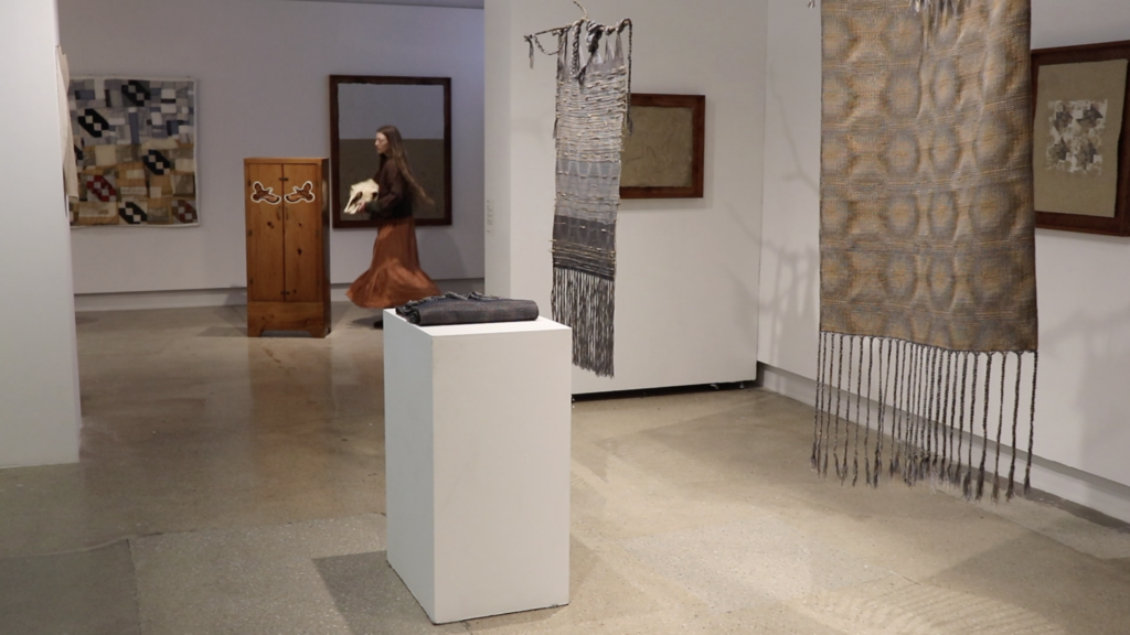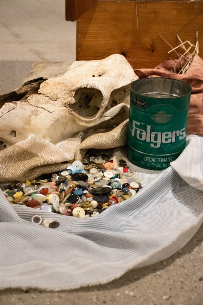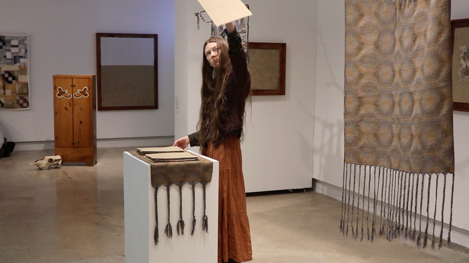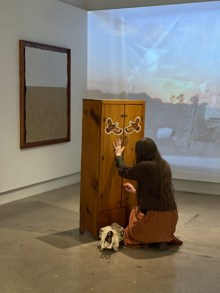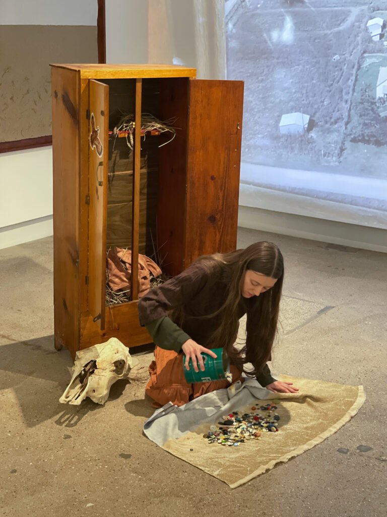 performance: cow skull, artist’s book, wheatstack, book wrapping, echo bales (i), projected video work, seeking steps, artist’s grandfather’s handmade gun cabinet, wheat from artist’s family farm, grandmother’s button collection, bag made by artist’s grandmother, Songs Ida Red and Queen of the Earth, Child of the Stars played from Pete Cooper’s album, ‘American Old Time Fiddle Tunes – 98, duration: 00:25:00