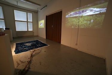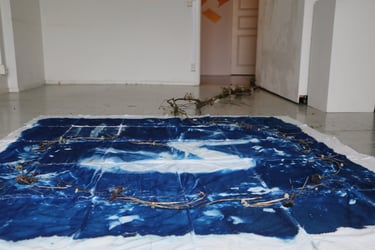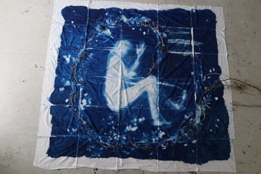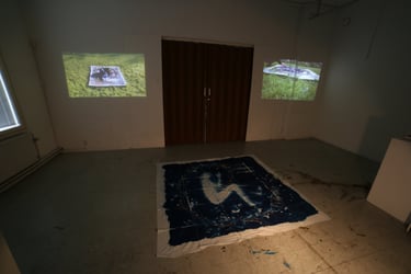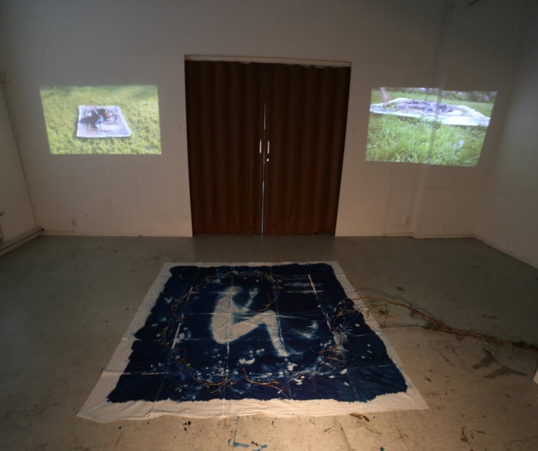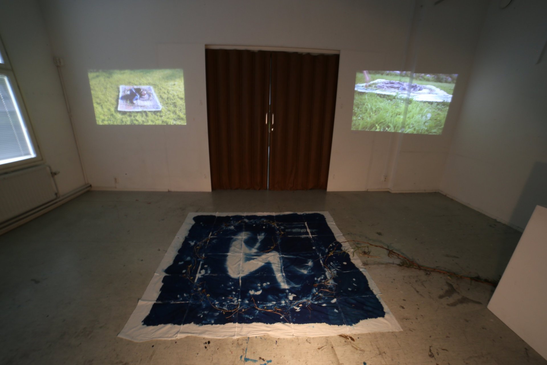 This installation includes a cyanotype that aesthetically alludes to ultrasound imagery and projected on the walls is video from the hours-long process of composing and exposing the cyanotype outdoors before, during, and after a morning’s dawn. Encircling the cyanotype of my body, a trail of forest limbs and plants weave throughout the building, out the back door, and into our metsä, our forest: an umbilical cord to the land, the land which births and sustains us all.