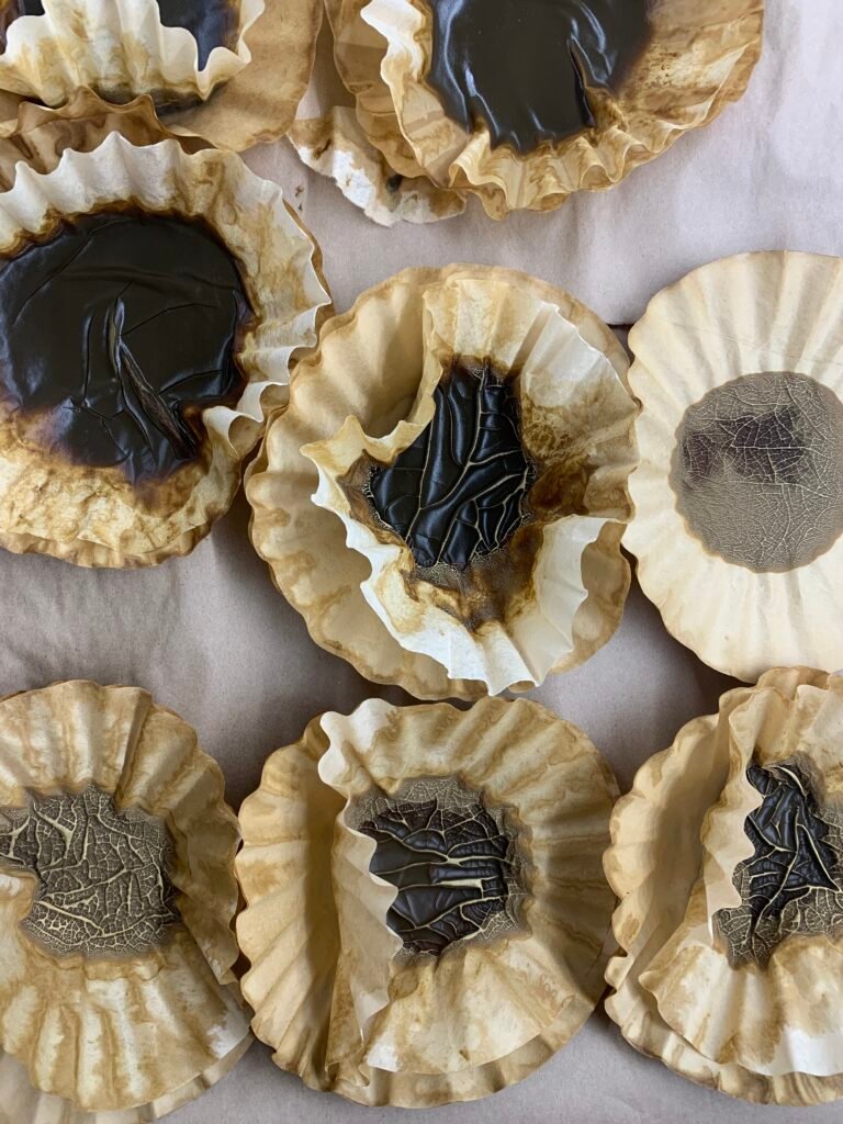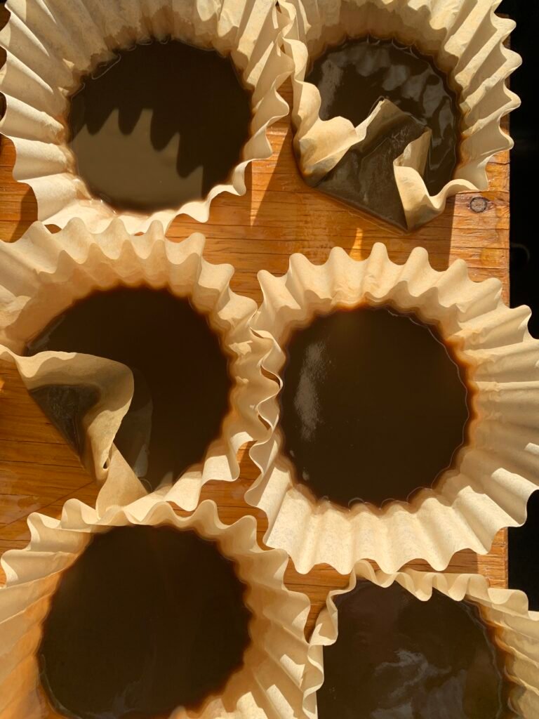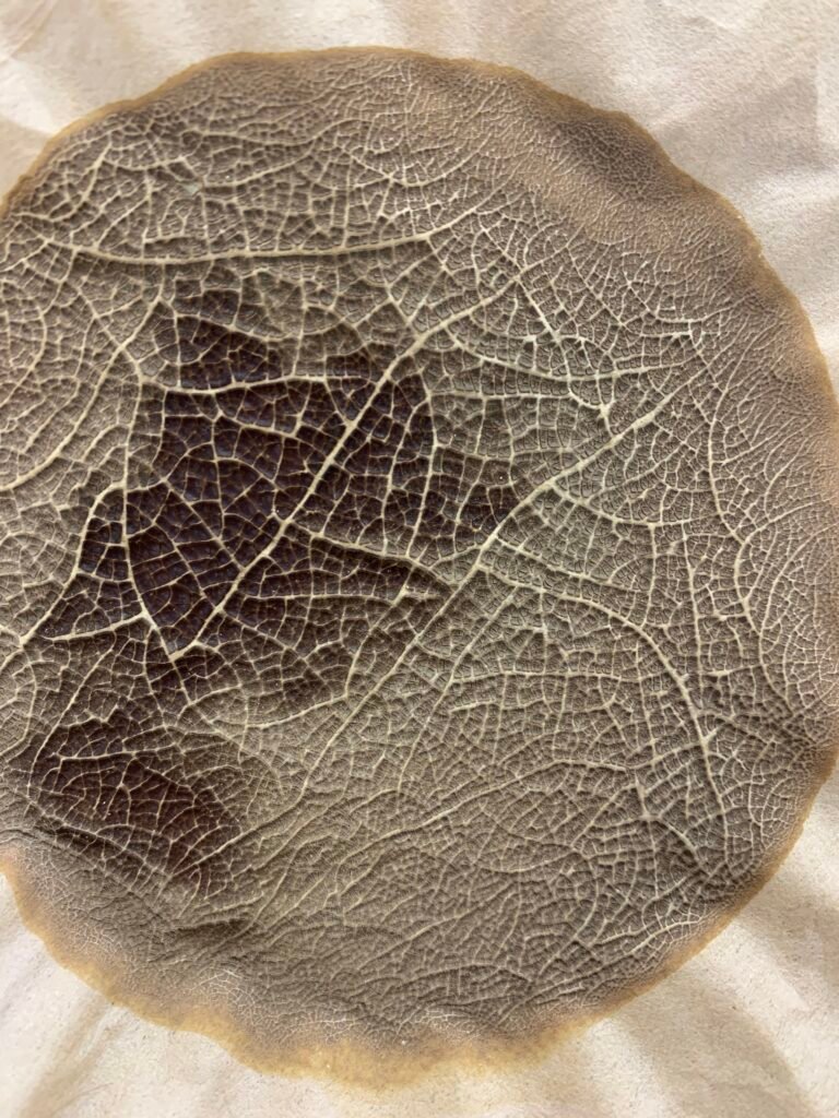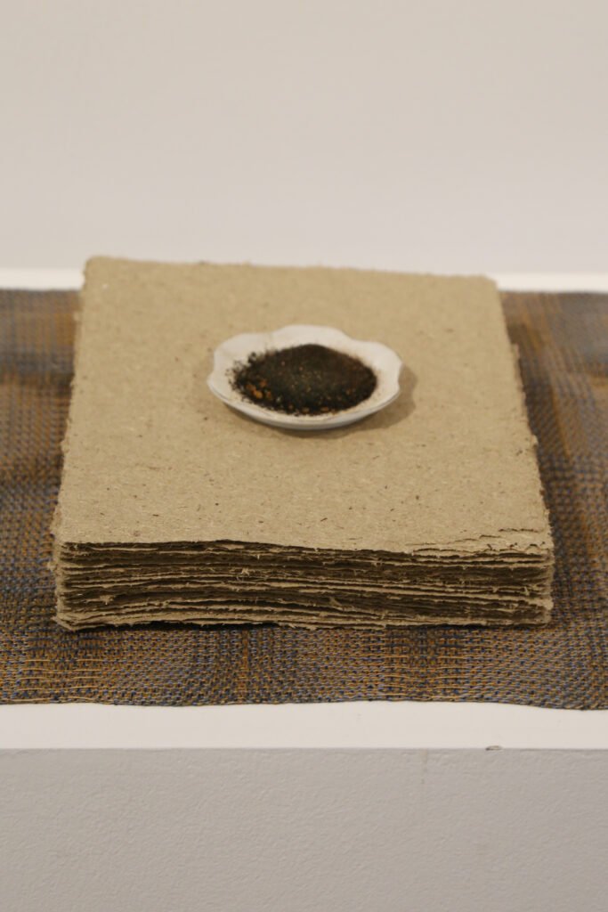wheat pigment distilled from wheat remnants from the summer harvest of 2025 from artist’s family farm in Southeast Kansas, ceramic dish found in artist’s grandmother’s collection