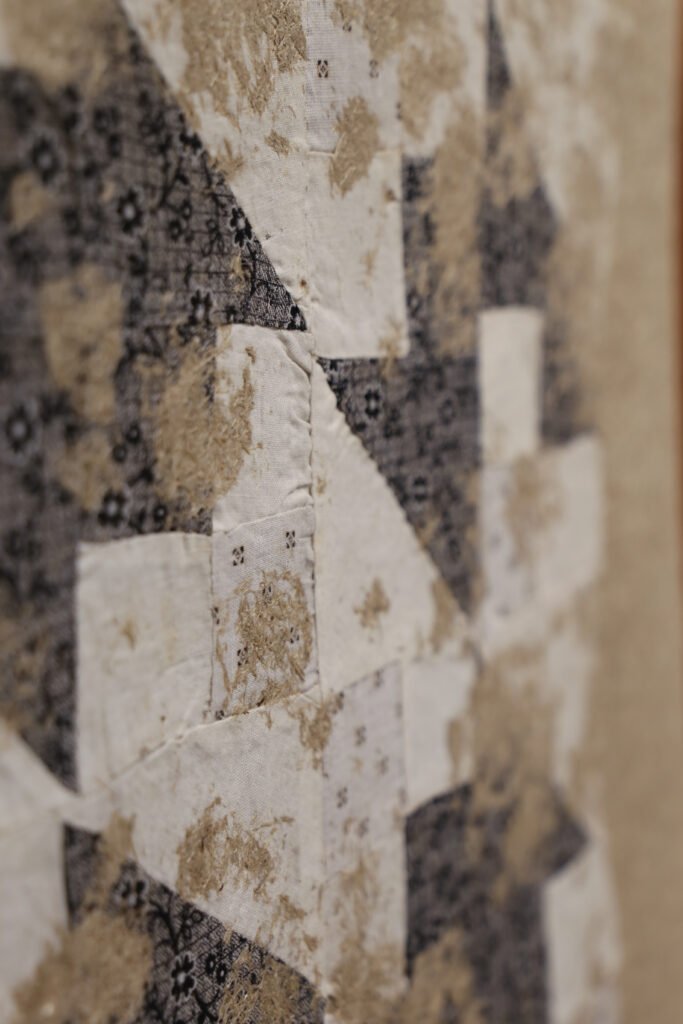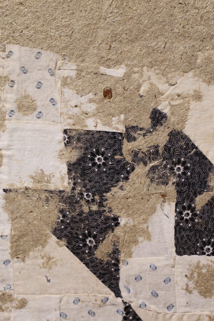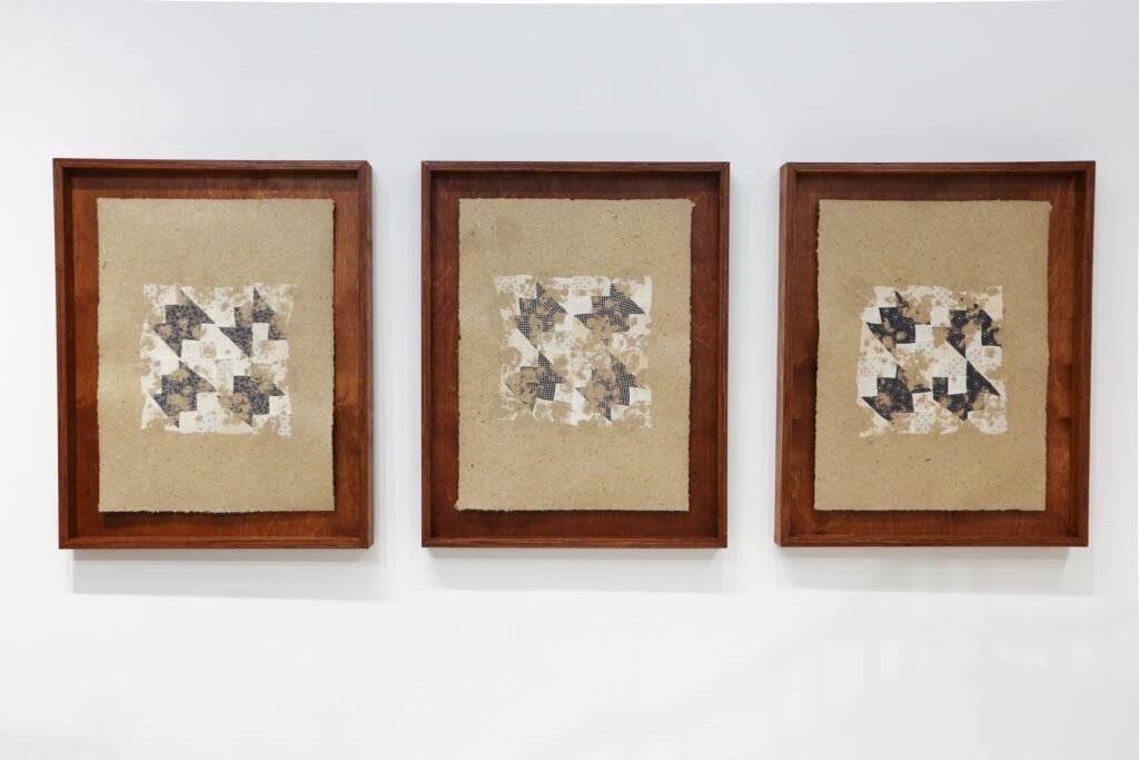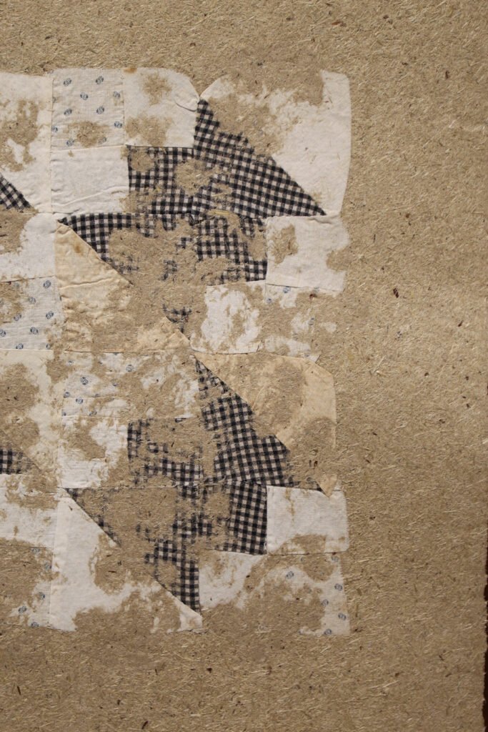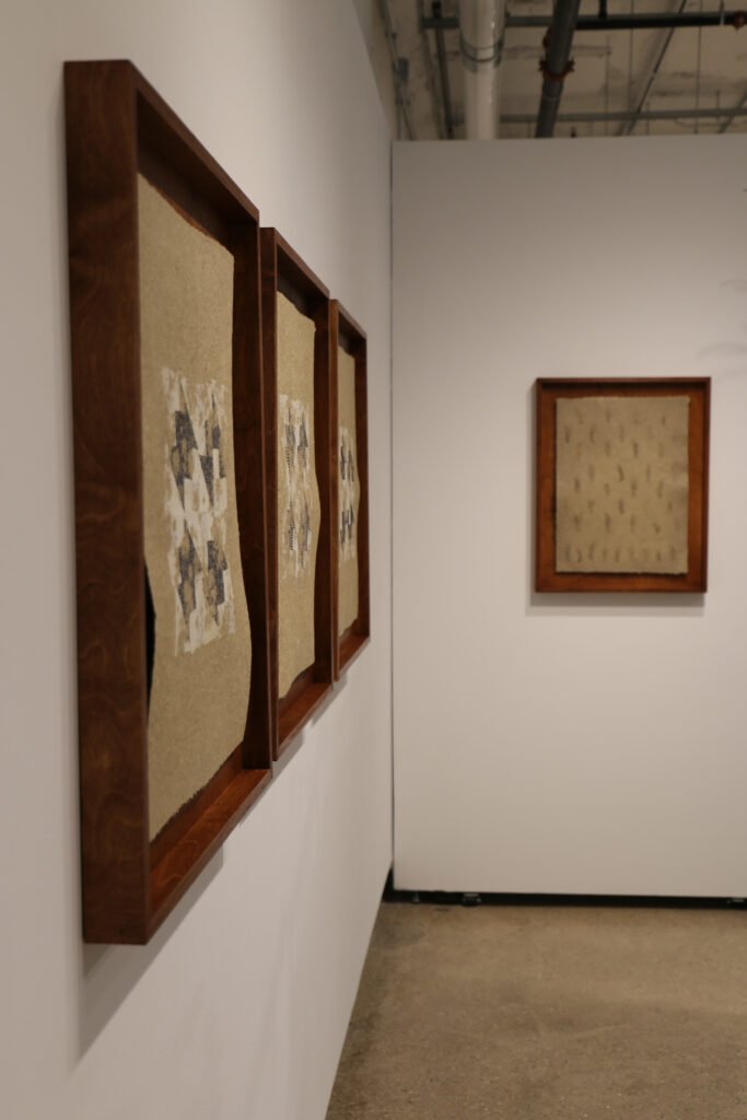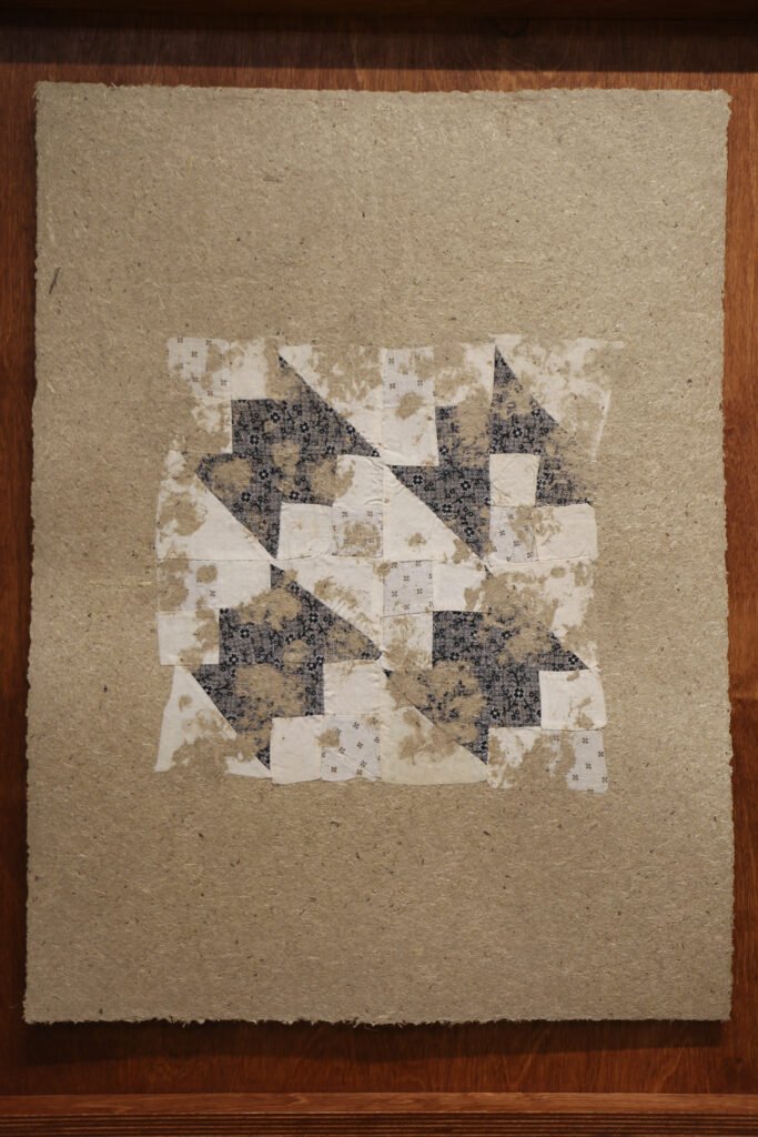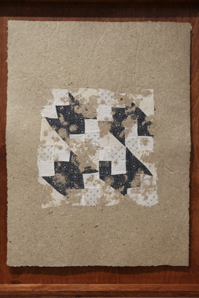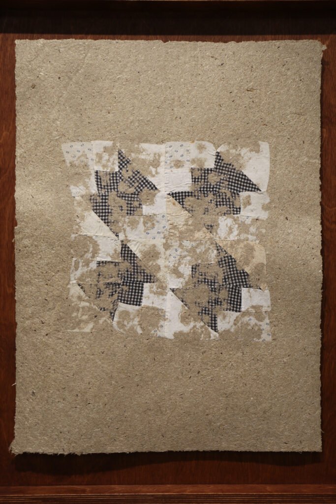handmade wheat paper made with wheat remnants from the summer harvest of 2025 from artist’s family farm in Southeast Kansas, found quilt squares, housed in handmade stained birch frames