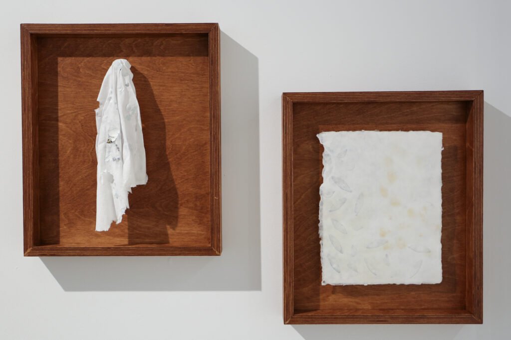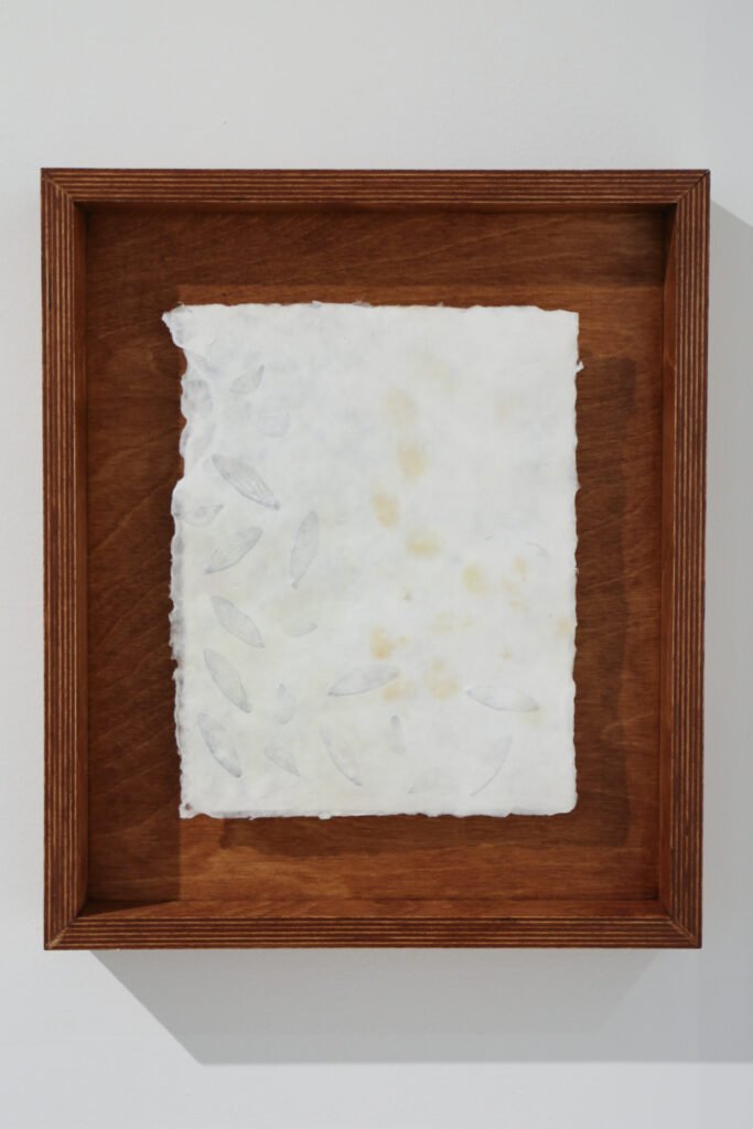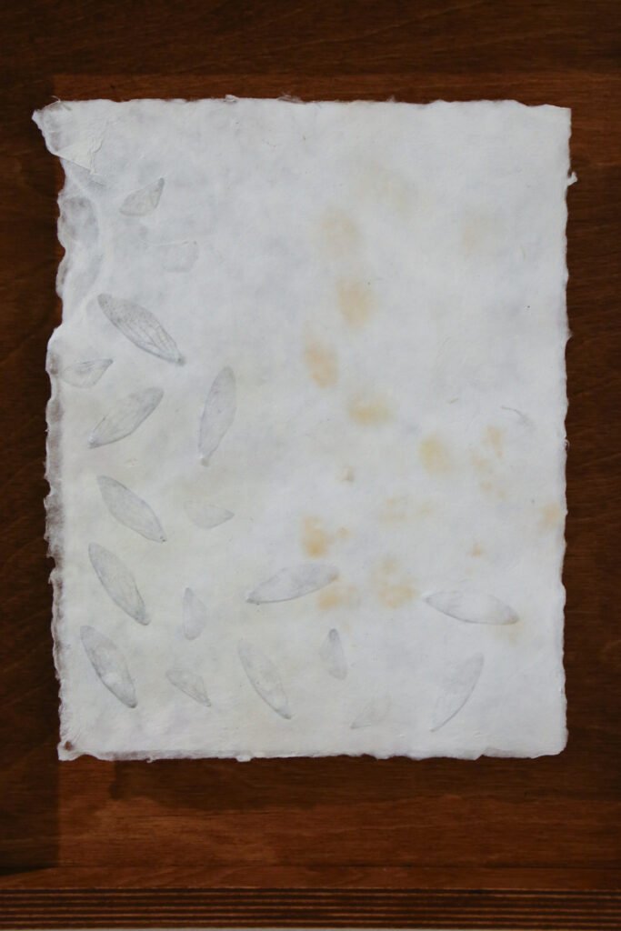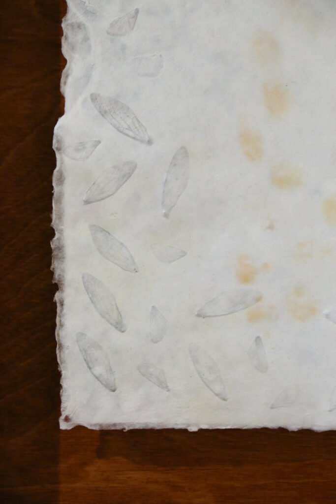 handmade abaca paper with cicada wings & chantilly snapdragon pigment, housed in handmade stained birch frame