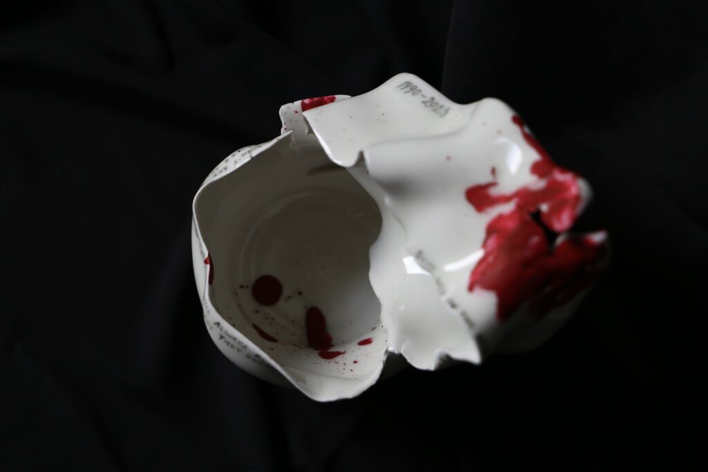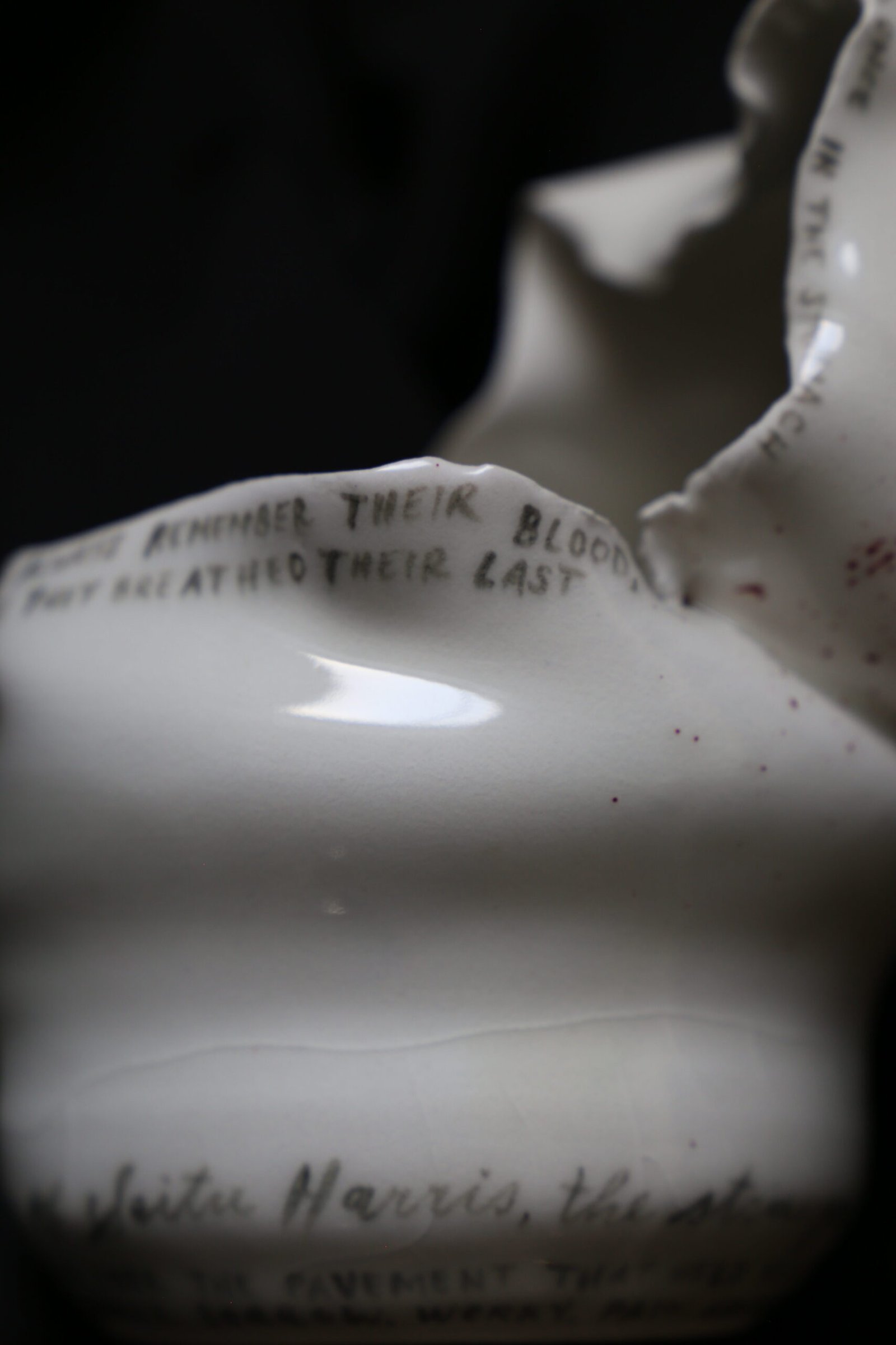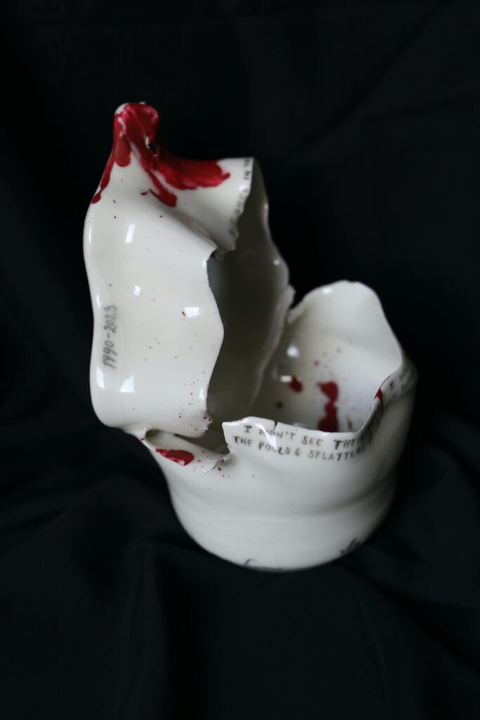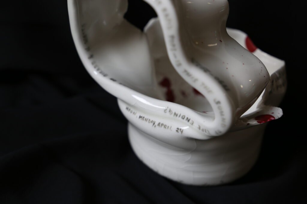 porcelain memorial vessel, handwritten text with black underglaze, red enamel paint, 13 x 15 x 18 cm