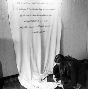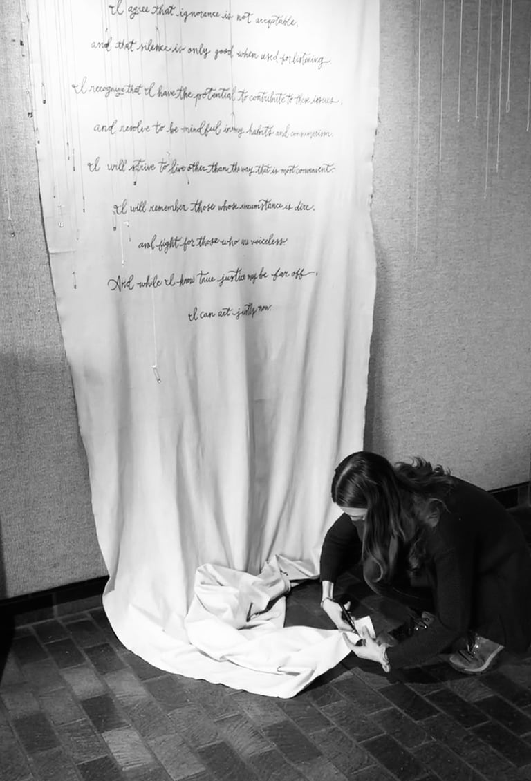 Towsley's work is a product of personal learning and exploration. Her work is an investigation seeking to educate and commemorate: a making in response to questions she has, musings, reflections, convictions, or realizations that she does not know enough about a critical history, or current event. There are times Towsley makes in order to document, others to help her spiritually or emotionally process, and others still where her work is a ritual—an act of making inspired by grief, mourning, awe, appreciation, or joy.