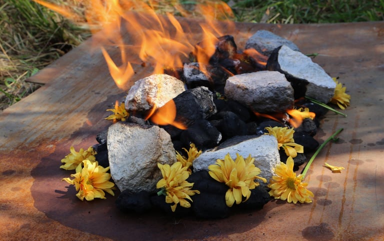 2019 | Performance, pyre, paper & sawdust-filled cast granite rock forms, flowers
